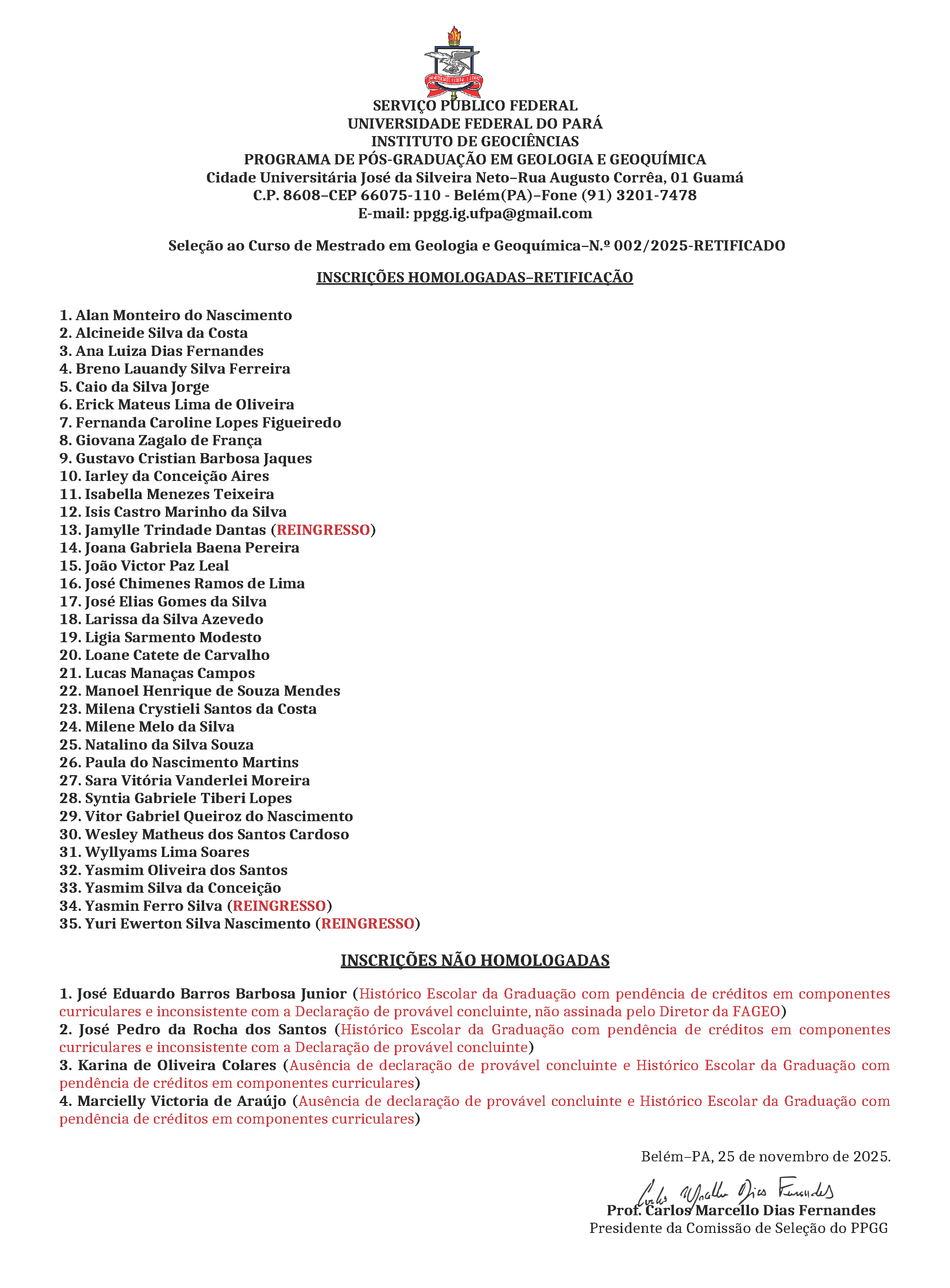 O Programa de Pós-graduação em Geologia e Geoquímica torna pública a retificação das inscrições homologadas após recursos.(Clique aqui)
