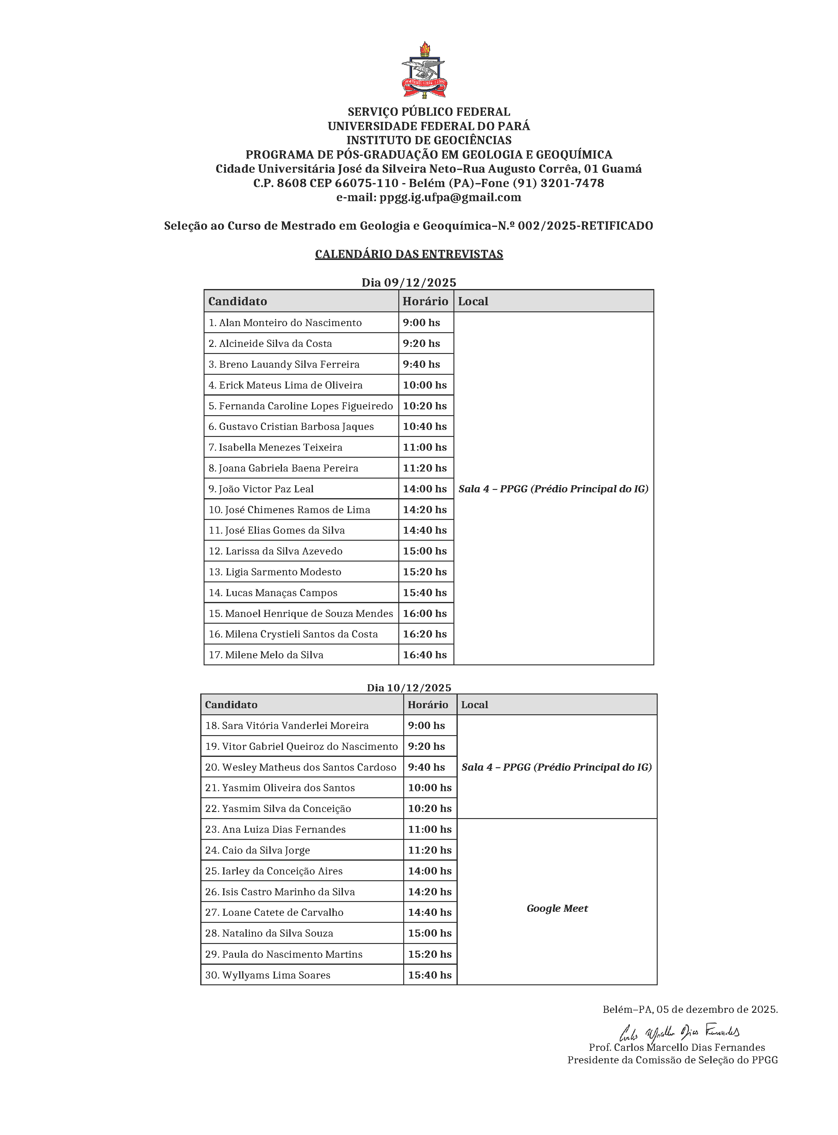 As entrevistas ocorrerão nos dias marcados na sala 04 do PPGG (Instituto de Geociências - UFPA). Foi garantida a realização de entrevista em formato online (google meet) nos casos definidos pelo Edital. Reforçamos que o atraso ou o não comparecimento do/a candidato/a ocasionará sua eliminação do processo, por isso orientamos aos mesmos que se atentem ao horário de sua entrevista.