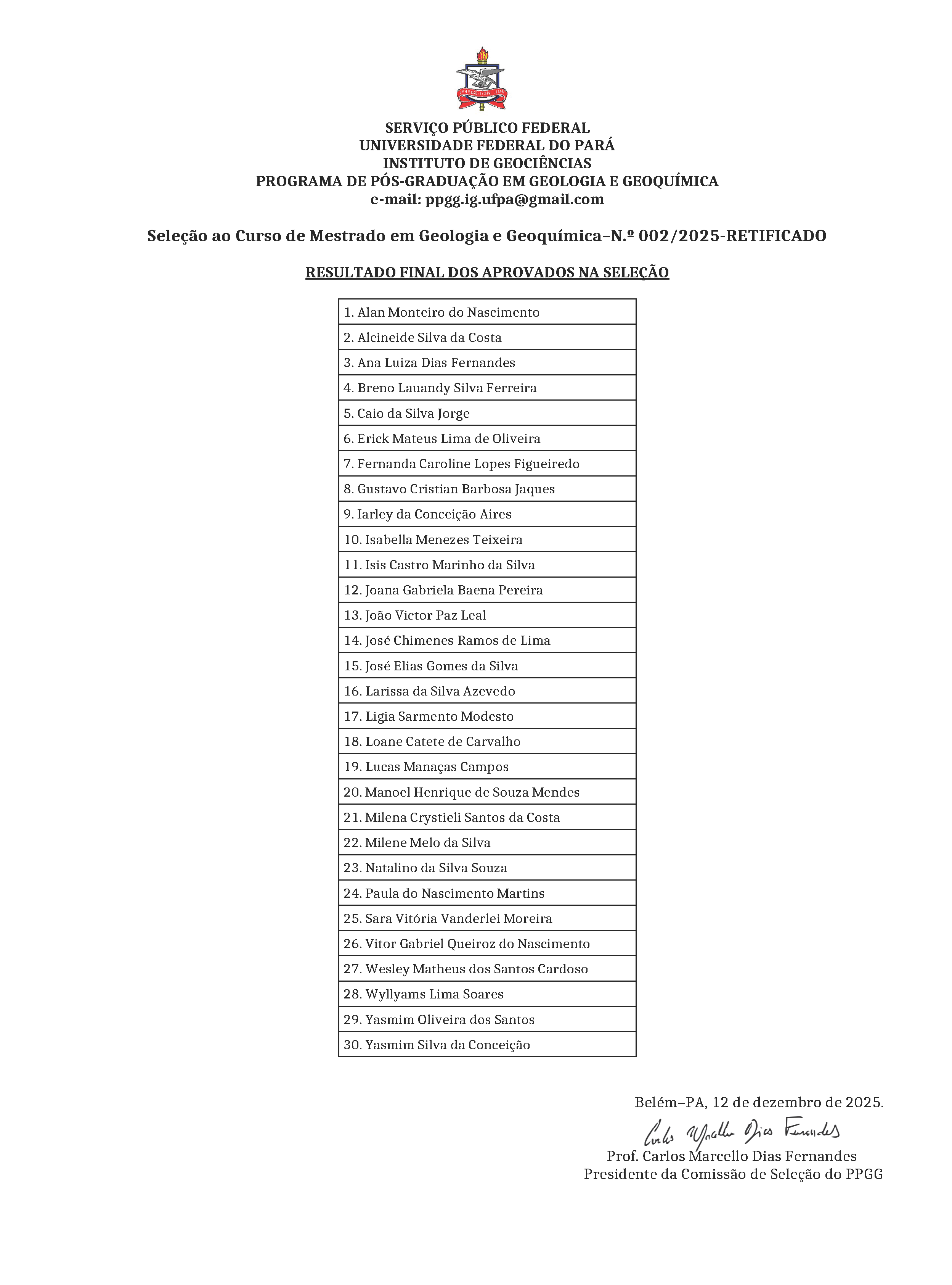 Processo Seletivo Mestrado 2026 | Resultado Final dos aprovados Em conformidade com o Edital 002/2025, o PPGG-UFPA torna público o resultado final dos aprovados na seleção de mestrado. Acesse aqui arquivo PDF. Anterior Siguiente